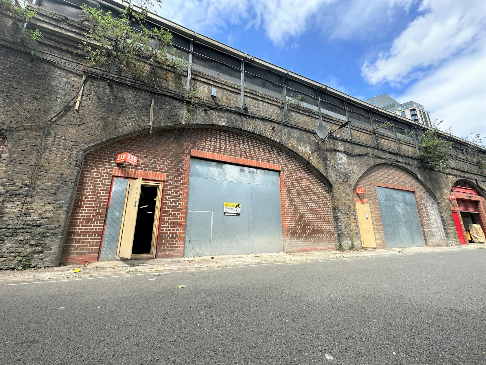 The arch is lined and accessed from Randall Road via a roller shutter door. Arch 116 has a separate pedestrian door fronting Randall Road.